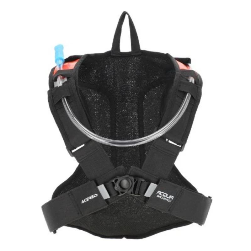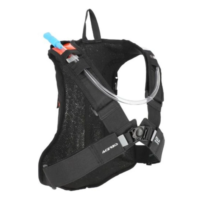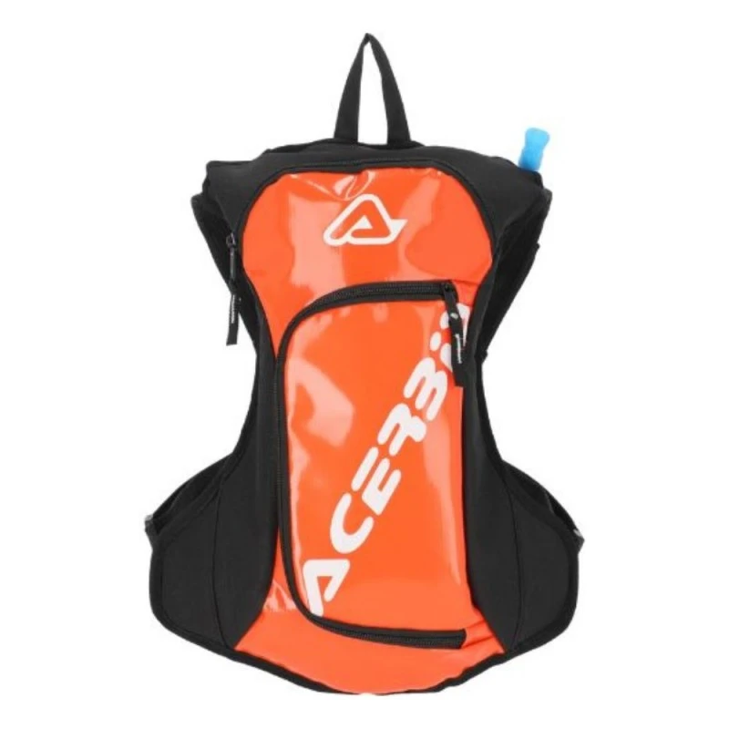Mochila ACERBIS Aqua Logo naranja / blanco. La mochila ACERBIS ACQUA LOGO es una mochila de 5 litros de capacidad, ideal para quienes necesitan un suministro de agua y quieren sustituir la riñonera por una mochila pequeña y cómoda. Cuenta con una bolsa de agua de 2 litros, permite una autonomía media de 3 horas y una bolsa de herramientas extraíble con imán. Además, su innovador sistema de cierre «X», con liberación rápida central y 4 ajustes de velcro, anula el efecto de balanceo y ofrece mayor comodidad.