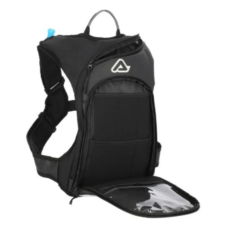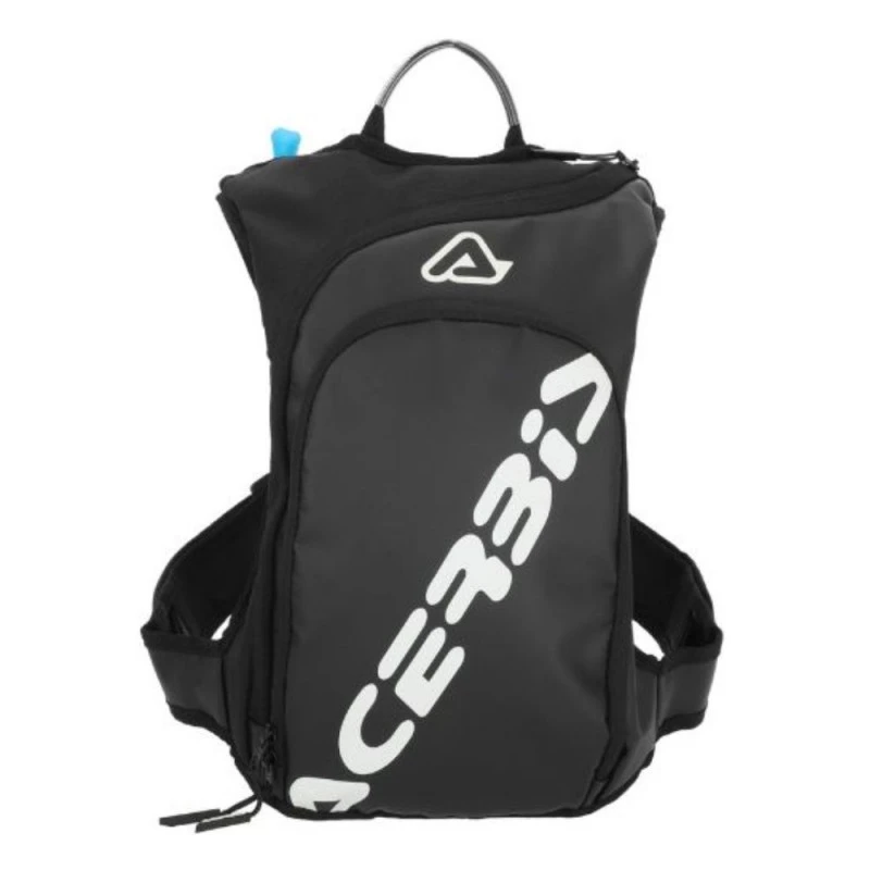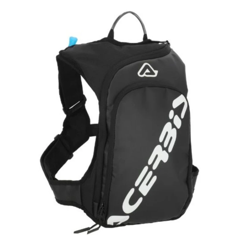 Mochila ACERBIS Sather 9L negro / blanco. La mochila ACERBIS SATHER es una mochila de 9 litros, que está fabricada en poliéster y PVC, ideal para quienes necesitan un suministro de agua y quieren sustituir la riñonera por una cómoda mochila. Dispone de una bolsa de agua de 2L que permite una media de 3h. de autonomía. Esta bolsa presenta varios bolsillos exteriores y un gran bolsillo interno. Además, cuenta con innovador sistema de cierre «X», con liberación rápida central y 4 ajustes de velcro.