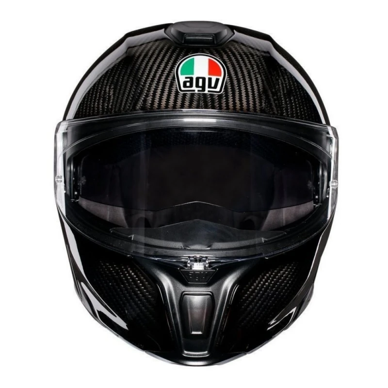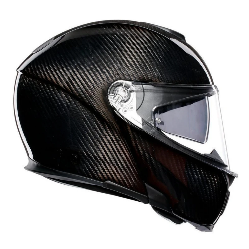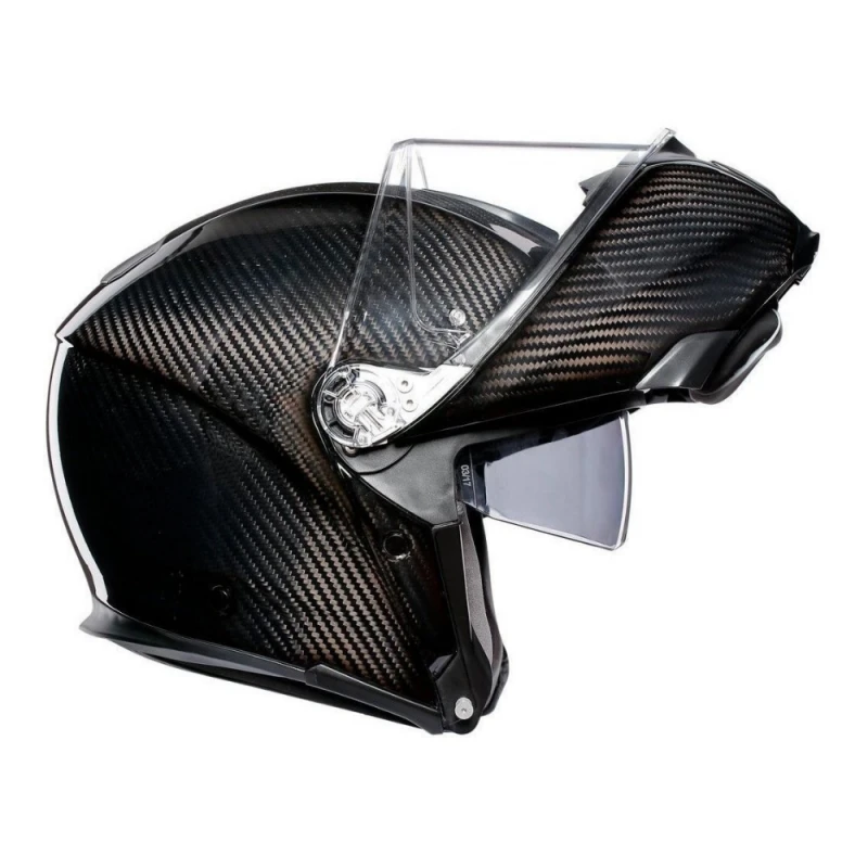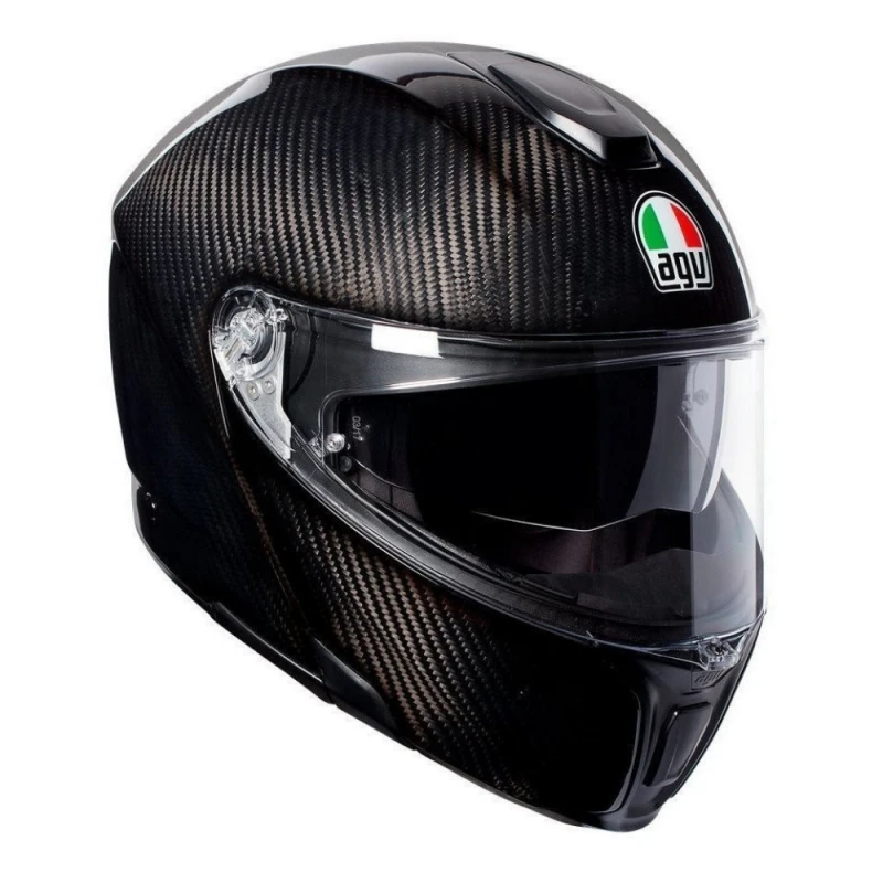 Casco AGV Sportmodular E05 Solid PLK carbon brillante. Está construido enteramente en fibra de carbono (calota y barbilla). Esta estructura específica ofrece el mismo nivel de protección que el casco Pista GP R de MotoGP, pero con una estructura increíblemente ligera, combinando los más altos niveles de comodidad y seguridad. Diseñado para ofrecer una vista horizontal de 190°, que es la capacidad del ojo humano, el casco SportModular ha sido concebido en el túnel de viento para garantizar su silencio, una gran estabilidad aerodinámica y una excelente ventilación.