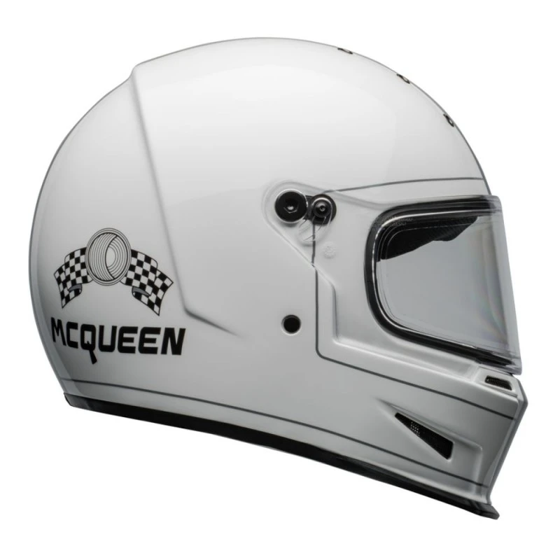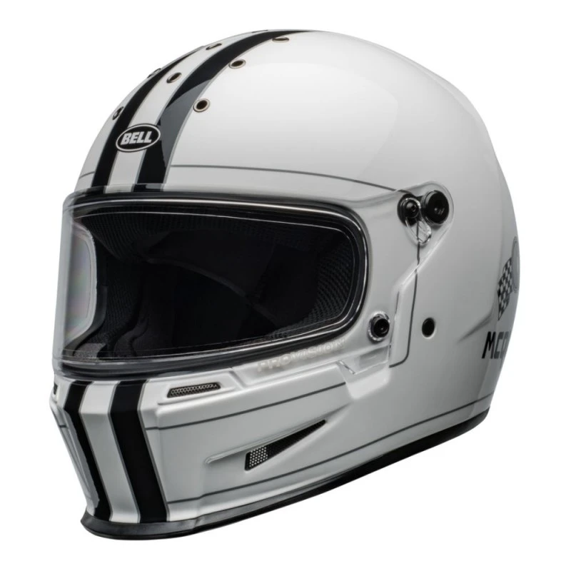 Casco BELL Eliminator Steve MCqueen B/W Stripes blanco brillo. El nuevo Eliminator te asegura una respuesta street firme y atrevida. 60 años de evolución plasmados en un casco sin postureos superfluos, que combinan un peso ligero con un ajuste perfecto y una protección con fama legendaria. Su diseño natural presenta una calota de compuesto de fibra de vidrio, que se puede combinar con pantalla o visera antivaho.