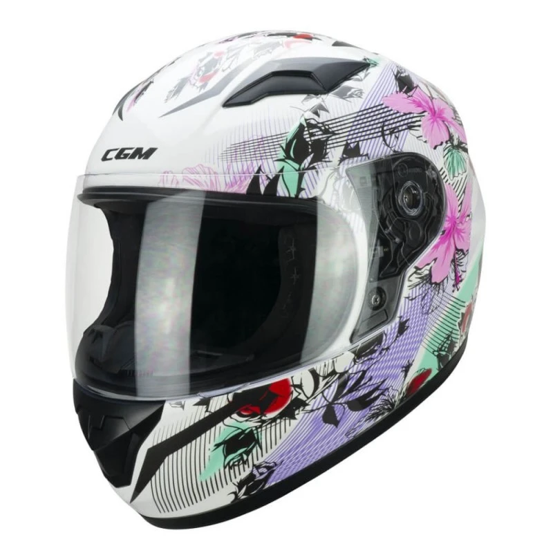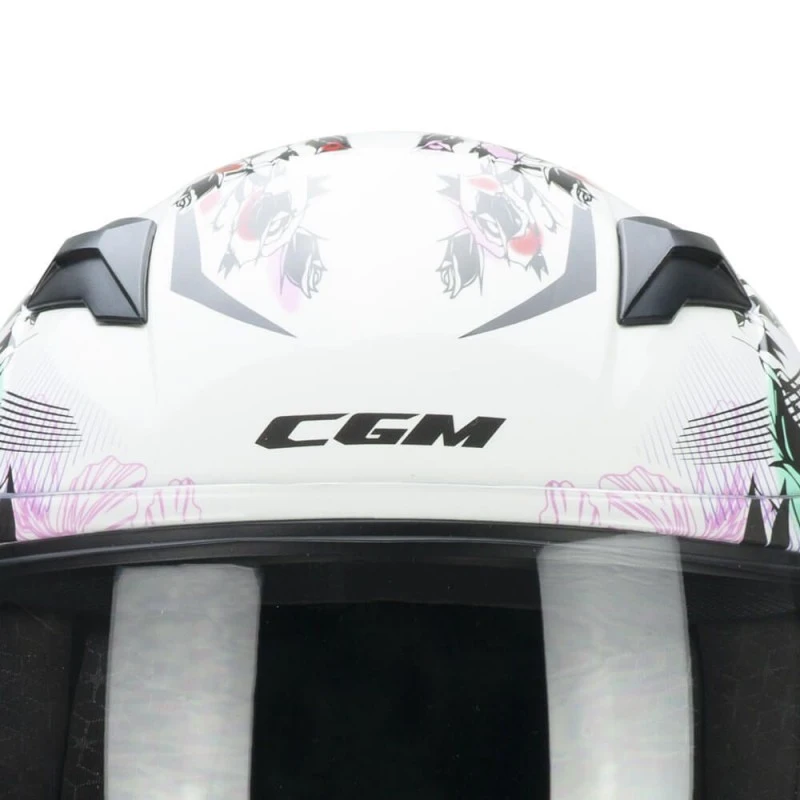 Casco CGM 265S Lucky Music blanco / rosa. El 265 LUCKY es el CGM integral dedicado a los jóvenes motociclistas. Casco ligero con tallas realizadas teniendo en cuenta la forma de calavera de los más pequeños, caracterizado por gráficos cautivadores para una protección segura y divertida de los jóvenes ciclistas. Equipada con una visera larga basculante antirayaduras con cierre rápido y un sistema de ventilación Air Stream System de tres zonas con canalización interior. Interior hexagonal termoformado extraíble para una mayor comodidad de uso, de tejido ExtraCool con costuras en contraste. El equipo se completa con un deflector de nariz, un deflector de mentón y un sujetador de correa elástica.