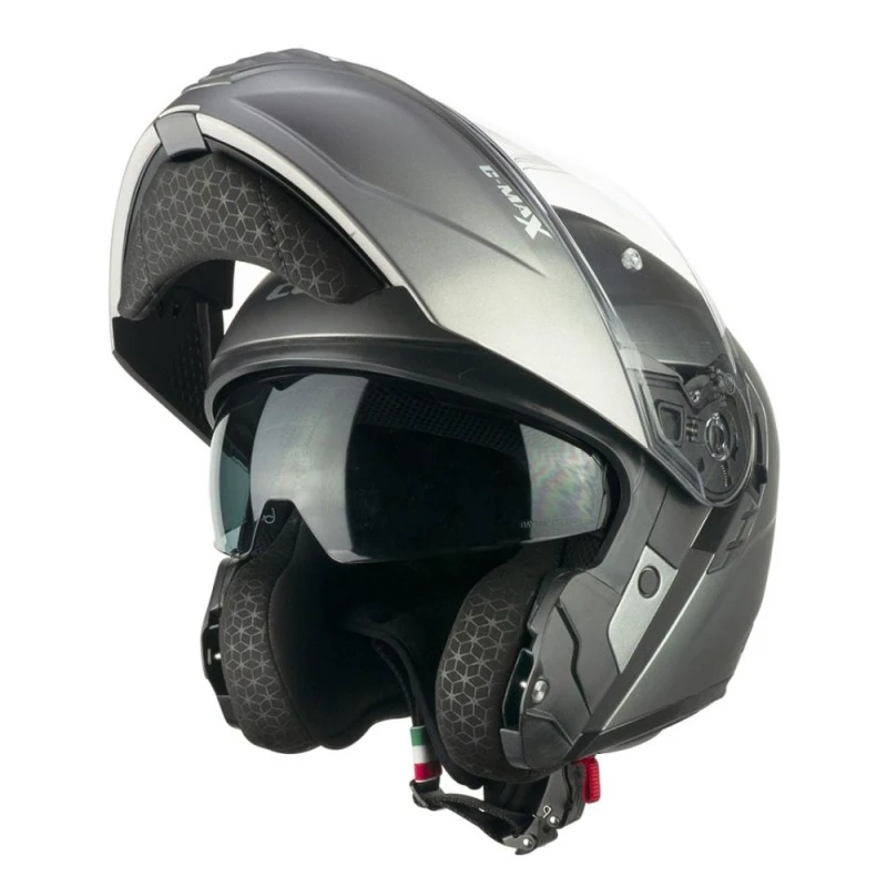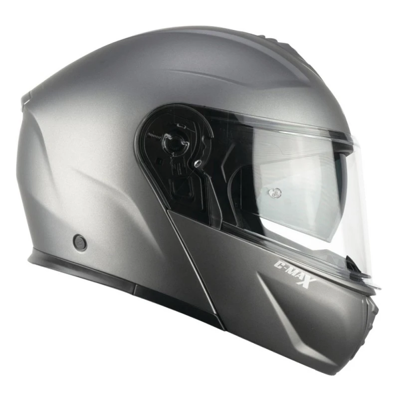 Casco CGM 569A C-Max Mono antracita satinado. C-MAX es el nuevo CGM modular dedicado a aquellos que eligen experimentar nuevas emociones todos los días. Estilo y funcionalidad se unen para ofrecerte comodidad y prestaciones vanguardistas en todas las condiciones, desde el habitual recorrido urbano hasta los senderos más aventureros, la doble homologación P/J te permite viajar con el casco modular en configuración cerrada o abierta. Equipada con visera con tratamiento antirayas, basculante, con bloqueo en posición cerrada y perfil superior aerodinámico, preparada para Pinlock 70 y visor solar retráctil interno. Con ventilación Air Stream System de tres zonas y canalización interna. Interior extraíble termoformado hexagonal para un mayor confort de ajuste, de tejido ExtraCool con bandas reflectantes para aumentar la seguridad pasiva y con posibilidad de intercomunicador, El acolchado interior está realizado con un alojamiento especial para las patillas de las gafas. Las características incluyen un deflector de nariz, un deflector de mentón y un soporte de correa elástica.