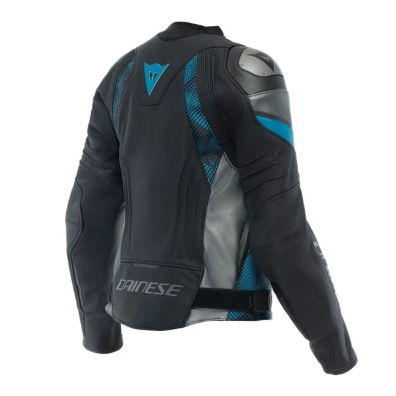 Chaqueta DAINESE Avro 5 Lady negro / teal / antracita . El confort aumenta aún más gracias a la nueva construcción del cuello fast-racing, un sistema inspirado en MotoGP™ que reduce totalmente la presión sobre el cuello. Para garantizar la máxima protección a los motoristas incluso a altas velocidades, la Avro 5 WMN incorpora las mismas soluciones técnicas que los trajes Dainese, integrando protectores certificados en hombros y codos, así como placas de aluminio desmontables en los hombros. La chaqueta está diseñada para alojar los protectores de espalda G1 y G2. Mezcla perfecta de protección y confort, la Avro 5 WMN es extremadamente versátil gracias a su forro térmico desmontable, su tejido de malla transpirable y sus orificios de ventilación laterales, que la hacen ideal para su uso en cualquier estación del año.
