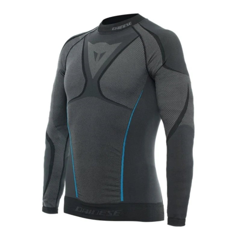 Camiseta DAINESE Dry LS negro / azul. Es una capa base de manga larga para hombre ideal para llevar debajo del mono, para usar durante todo el año y en la temporada más cálida, gracias a la construcción en tejido hidrófobo Dryarn, una tecnología que optimiza el proceso de gestión del sudor y la humedad, manteniendo el cuerpo seco.