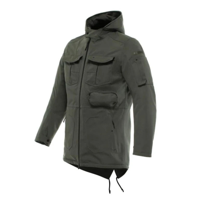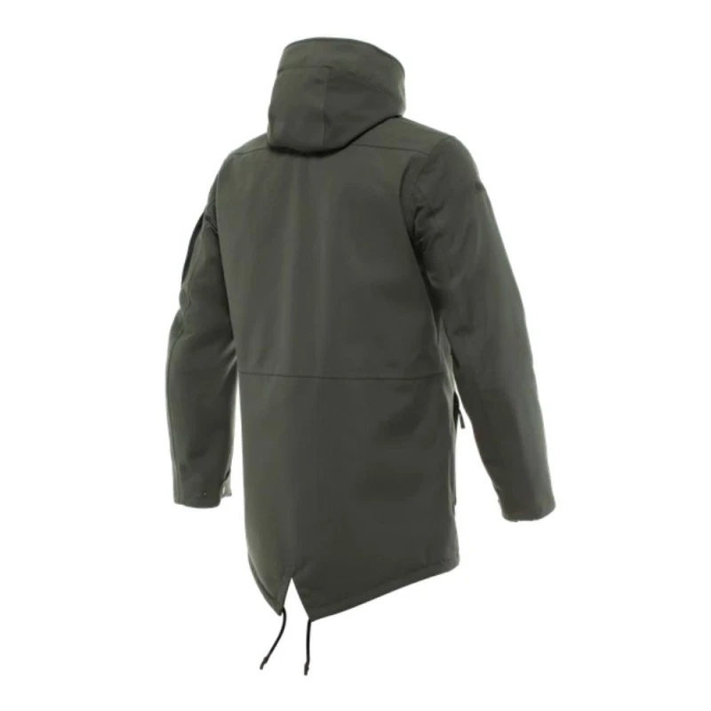 Chaqueta DAINESE Duomo Absoluteshell Pro Parka verde. Los materiales de calidad se unen al estilo de moda en la parka Duomo Absøluteshell™ Pro, con el clásico corte largo de las parkas militares y diseñada para satisfacer las exigencias de la conducción urbana durante todo el año en cualquier condición meteorológica. Con capucha y dobladillo de cola de pez, esta chaqueta está confeccionada con membrana impermeable laminada Absøluteshell™ Pro, que permite que la prenda se seque rápidamente y proteja incluso de las temperaturas más frías. El confort térmico aumenta aún más gracias a la inclusión de una capa de guata térmica desmontable que también puede llevarse por separado si es necesario. A los altos niveles de confort y funcionalidad se unen unos niveles de protección igualmente elevados, gracias a soluciones como los protectores desmontables con certificación Pro-Armor L1 en hombros y codos, protectores suaves con amplias superficies ventiladas que también aumentan el confort térmico. La chaqueta también cuenta con un bolsillo diseñado para alojar los protectores de espalda G1 y G2.