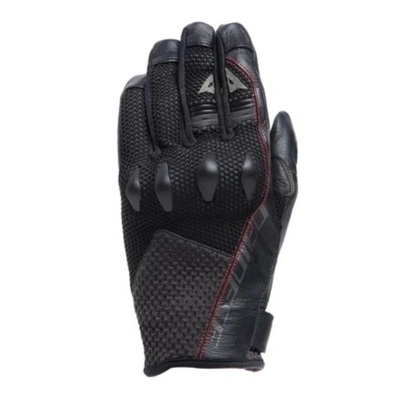 Guantes DAINESE Karakum Ergo Tek negro / negro. Son un par de guantes de aventura de verano, ligeros y ventilados, dispuestos para cualquier aventura en los tiempos más cálidos. Confeccionados con tejido tricot ventilado y flexible y palma de piel de cabra, ofrecen suavidad y resistencia donde se precisa, asegurando una enorme sensibilidad y control sobre los mandos de la motocicleta. Los protectores de los nudillos Luego-Tek.