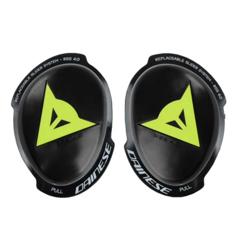 Deslizaderas DAINESE Knee Rss 4.0 Full Kit negro / amarillo fluor. Kit completo de deslizador de rodilla con Replaceable Slider System (RSS), compatible con los trajes de cuero Dainese. Incluye base de fijación con velcro para fijar al traje y deslizador para fijar a la base.