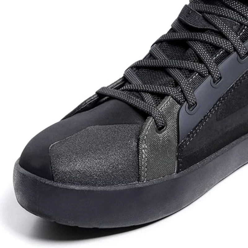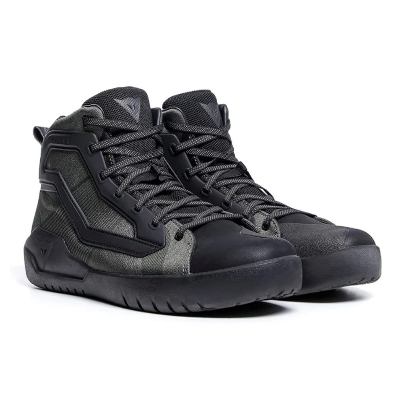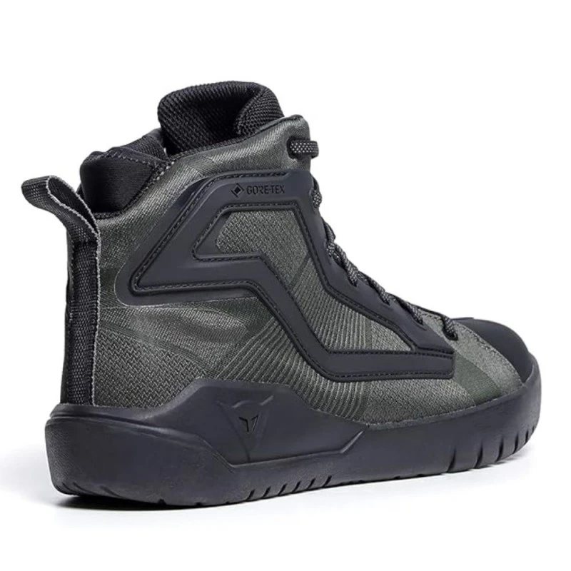 Botines DAINESE Urbactive Gore Tex negro / army verde. Calzado de motocicleta impermeables y transpirables, ideales para emplear en cualquier ambiente urbano, en todas y cada una de las condiciones. La membrana Gore-Tex® Extended y la composición del tejido de la parte superior hacen que las polivalentes zapatillas Urbactive Gore-Tex sean capaces para su uso en las 3 estaciones del año.La utilidad se combina con un elevado nivel de seguridad, por medio de los refuerzos en el tobillo, y el exoesqueleto, que aumenta el grado de estabilidad en la conducción.Las suelas están diseñadas para asegurar la máxima resistencia a la deformación en el caso de impacto, y están fabricadas con la tecnología Groundtrax®, que garantiza el confort, la estabilidad y el agarre en las clavijas del pie, por lo que las zapatillas Urbactive Gore-Tex son exageradamente cómodas y convenientes para un uso incesante a lo largo de todo el día. La comodidad asimismo se ve reforzada por su ligereza, que aumenta el confort al pasear. La plantilla Ortholite® garantiza la máxima transpirabilidad y una amortiguación perdurable.