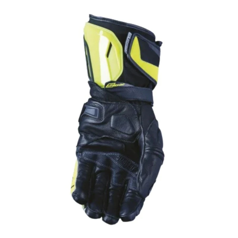 Guantes FIVE RFX WP negro / amarillo fluor. El guante de moto Five RFX WP ha sido desarrollado para satisfacer a los apasionados de las motos deportivas que aman sentir la carretera aun cuando llueve. Desarrollado para una conducción en carretera, mas perfecto para cualquier persona que ama el motociclismo. Seguro que te enamorarás de este guante, el cuál se semeja mucho a los que emplean nuestros pilotos profesionales oficiales con una sensibilidad inusual y otras cualidades que lo hacen agradable para el uso diario. Un guante que hereda detalles inspirados en la conducción competitiva y al tiempo, presenta detalles que generalmente se reservan para conducción en carretera o incluso urbana. Su construcción de piel de cabra con costuras externas, un puño que emula el estilo del RFX Race y su protección de nudillos en carbono de una pieza FIVE ErgoProtech hacen que parezca realmente deportivo. La membrana impermeable y transpirable 5 DryTech, crea una barrera contra la lluvia así como PU digital antideslizante. Los refuerzos y las inserciones de tela elástica y repelente al agua lo hacen muy efectivo con mal tiempo. Los sistemas Touch Screen y Clear Visión Pad lo transformarán en su leal compañero en el día a día. No dispone de aislamiento térmico, por lo que puede concentrarse únicamente en el rendimiento, perfecto para cuando las temperaturas son suaves.