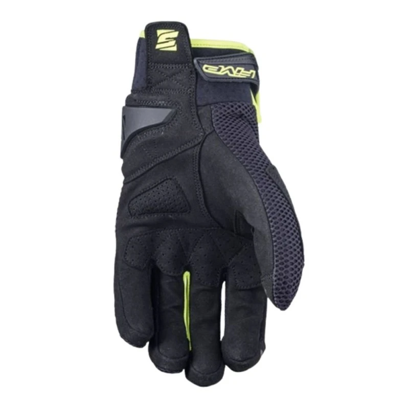 Guantes FIVE RS5 Air negro / amarillo fluor. Los nuevos RS5 AIR (compilación 2020) son los guantes de verano más ventilados que Five ha fabricado. Pensados para motoristas que circulan a diario por las calles de la ciudad y que procuran la máxima transpiración en los días más calurosos del verano. Confeccionados principalmente en tejido de Airmesh 3D de celda ancha para una mayor entrada del flujo de aire. Para ofrecer una flexibilidad máxima, los guantes Five RS5 AIR disponen de Lycra entre los dedos anular y medio además de esto para garantizar el compromiso perfecto entre flexibilidad y ventilación.
