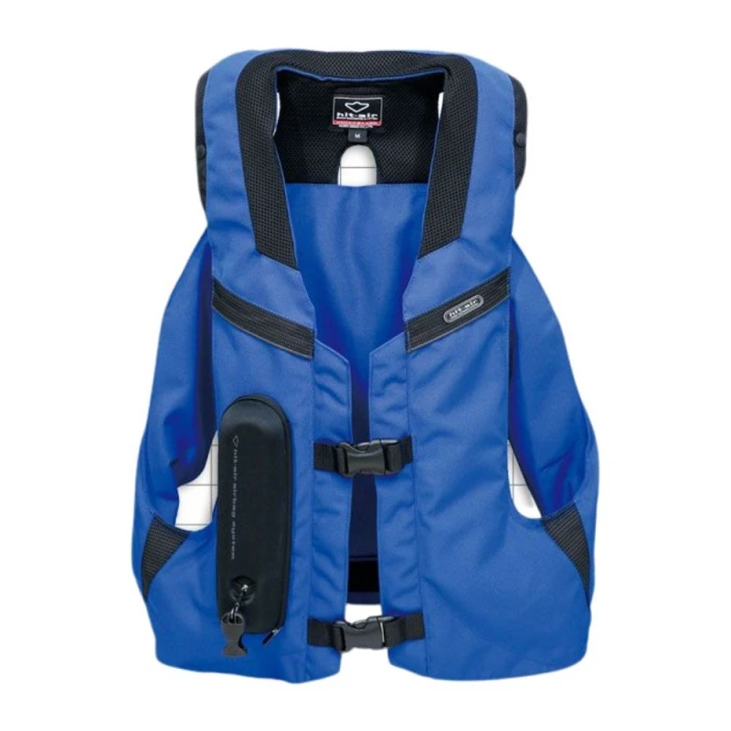 Chaleco HIT AIR MLV2-C azul. Está realizado en cordura de máxima calidad para la abrasión y usa protecciones certificadas “CE” para proteger hombros, codos y espalda. Pero lo más importante es que el Chaleco “Hit Air” también incorpora un sistema tipo “Air-Bag” que en el caso de un accidente en el que el motorista salga lanzado de la moto, una bolsa de aire se infla instantáneamente (0,5 segundos o menos) para proteger el cuerpo del motorista.