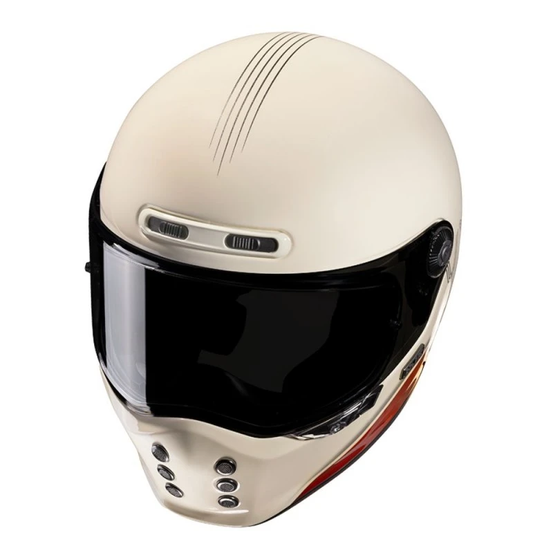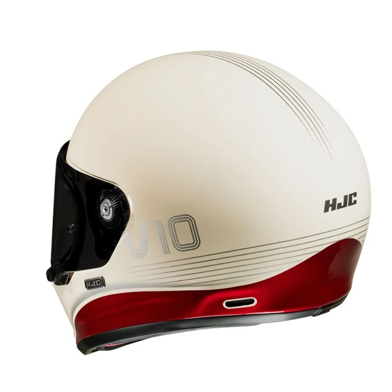 Casco HJC V10 Tami MC1. El V10 va más allá del aspecto vintage con características de la nueva era, como una fibra de vidrio ligera calota, rendimiento aerodinámico, lengüetas de emergencia para mayor seguridad, interior desmontable y lavable, y tornillos fáciles para una rápida sustitución de la visera. Este casco es compatible con Bluetooth con Smart HJC.