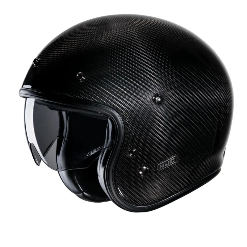 Casco HJC V31 Carbon negro. El V31 es un casco abierto de estilo retro compuesto por un avanzado compuesto de fibra de vidrio calota para proporcionar un casco ligero. Este casco ¾ cuenta con un sol integrado de 3 posiciones Pantalla con revestimiento antiarañazos que se despliega fácilmente para deslizarse hacia arriba o hacia abajo. La V31 también incluye una visera de pico extraíble de 3 broches para completar el aspecto retro. Las almohadillas son extraíbles y lavables y los bolsillos de los altavoces están preparados para la comunicación Bluetooth.