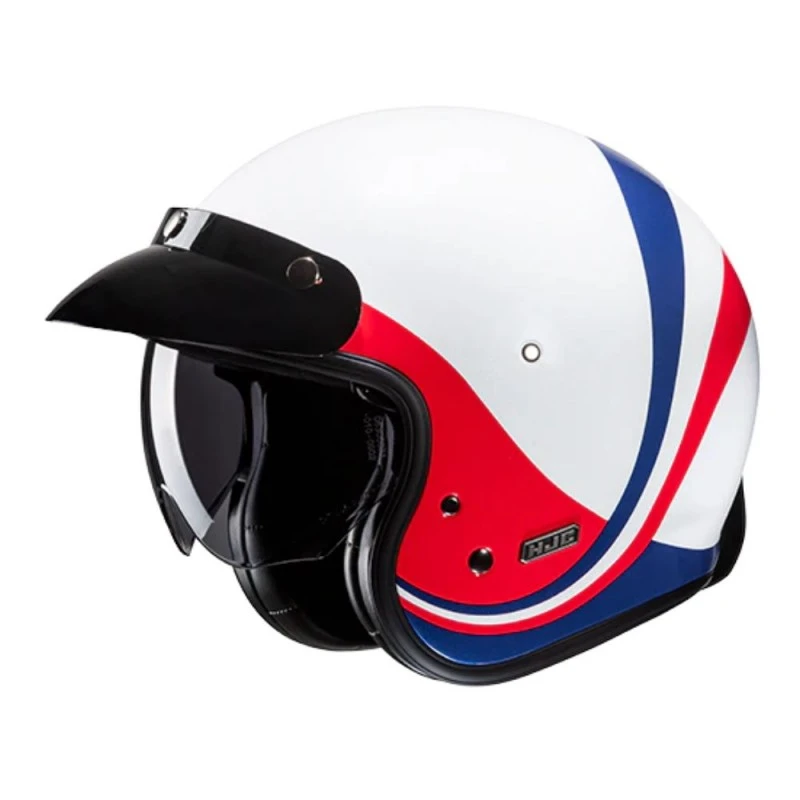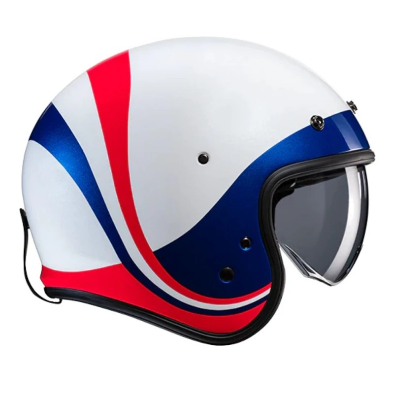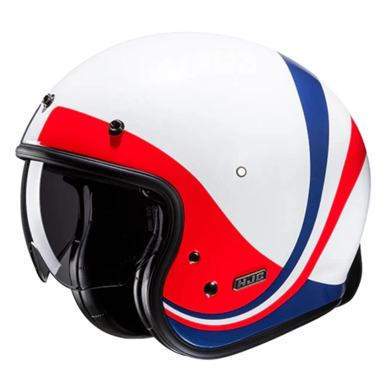 Casco HJC V31 Emgo MC21. El V31 es un casco abierto de estilo retro compuesto por un avanzado compuesto de fibra de vidrio calota para proporcionar un casco ligero. Este casco ¾ cuenta con un sol integrado de 3 posiciones Pantalla con revestimiento antiarañazos que se despliega fácilmente para deslizarse hacia arriba o hacia abajo. La V31 también incluye una visera de pico extraíble de 3 broches para completar el aspecto retro. Las almohadillas son extraíbles y lavables y los bolsillos de los altavoces están preparados para la comunicación Bluetooth.
