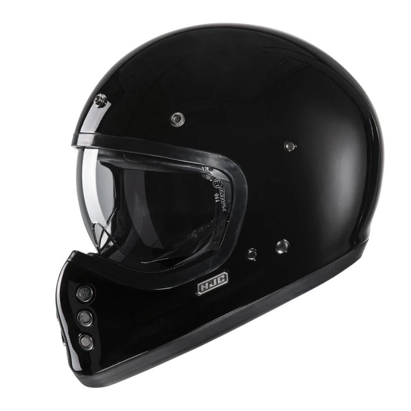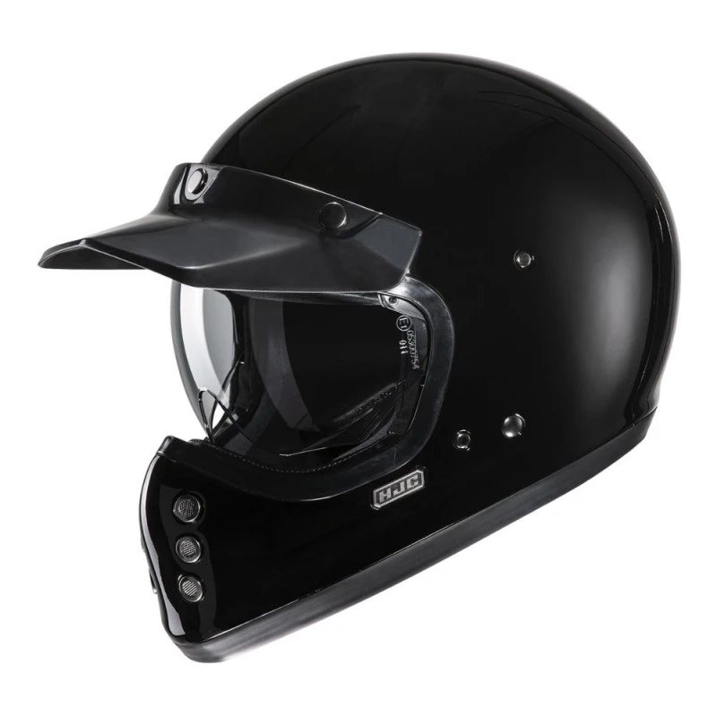 Casco HJC V60 negro. Con un estilo tradicional y un toque moderno, el HJC V60 agrega una nueva categoría de cascos a nuestra gama off-road para dos mil veintidos. Inspirado en el FG-01 original de la década de 1980, el V60 va más allá del aspecto vintage con características de la nueva era, como una calota de fibra de vidrio ligera, un enorme visor solar interior IS-10, huecos para altavoces incorporados, interior extraíble y lavable, y almohadillas para las mejillas con liberación de emergencia para mayor seguridad.