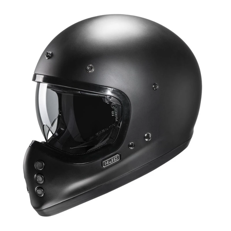 Casco HJC V60 negro semi mate. Con un estilo tradicional y un toque moderno, el HJC V60 agrega una nueva categoría de cascos a nuestra gama off-road para dos mil veintidos. Inspirado en el FG-01 original de la década de 1980, el V60 va más allá del aspecto vintage con características de la nueva era, como una calota de fibra de vidrio ligera, un enorme visor solar interior IS-10, huecos para altavoces incorporados, interior extraíble y lavable, y almohadillas para las mejillas con liberación de emergencia para mayor seguridad.
