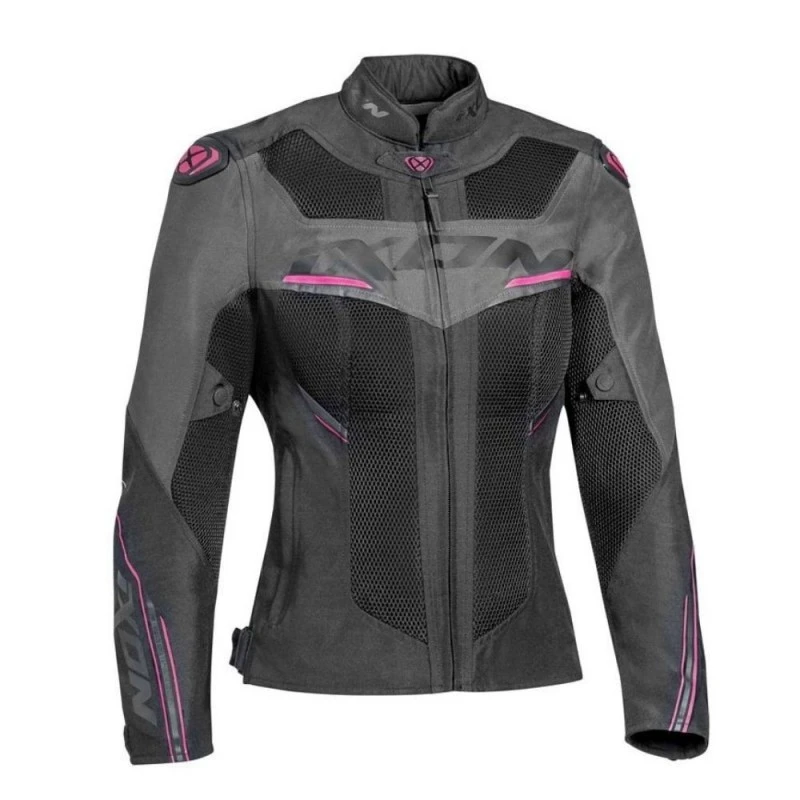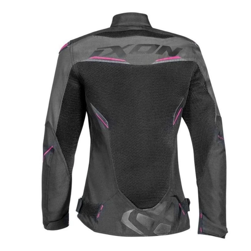 Chaqueta IXON Draco Lady negro / antracita / fucsia. Chaqueta textil deportiva para mujer con diseño derivado de la gama de competición de Ixon. Confeccionada en tejido de poliéster 600D de alta resistencia a la abrasión con extensos paneles de malla horadada 3D para una genial ventilación en la temporada estival. Incorpora protectores de codos y hombros certificados por la CE (Nivel 2) y sliders externos en lo hombros para mayor seguridad.