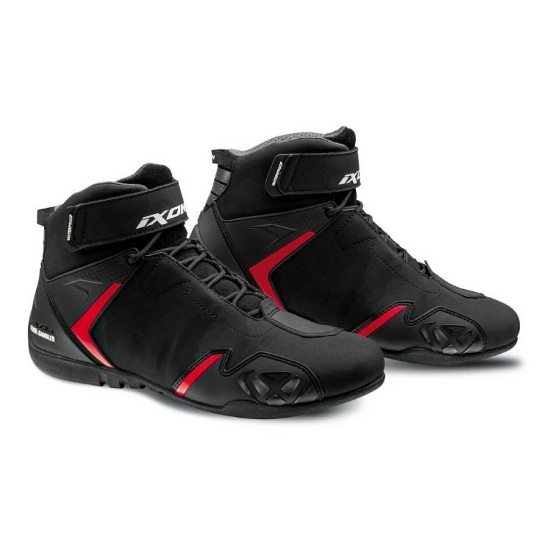 Botas IXON Gambler WP negro / rojo. Diseño deportivo y membrana impermeable y transpirable para mayor utilidad en diferentes tiempos. Dan un genial ajuste y confort y además de esto garantizan una inmejorable seguridad merced a a las protecciones situadas en la puntera, el talón y la zona del cambio. El cierre a través de velcro y cordones es seguro y veloz.