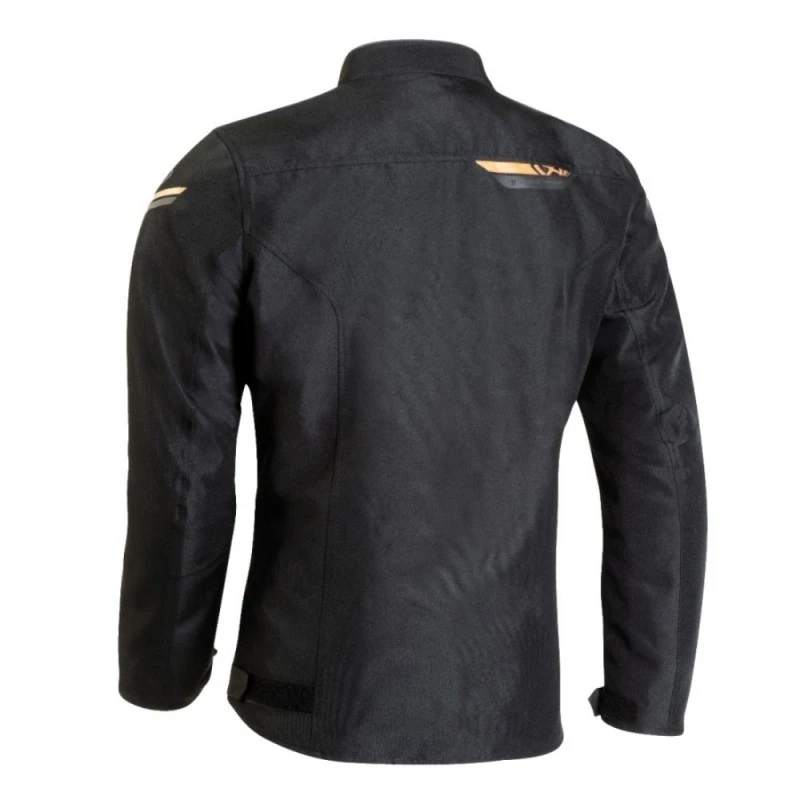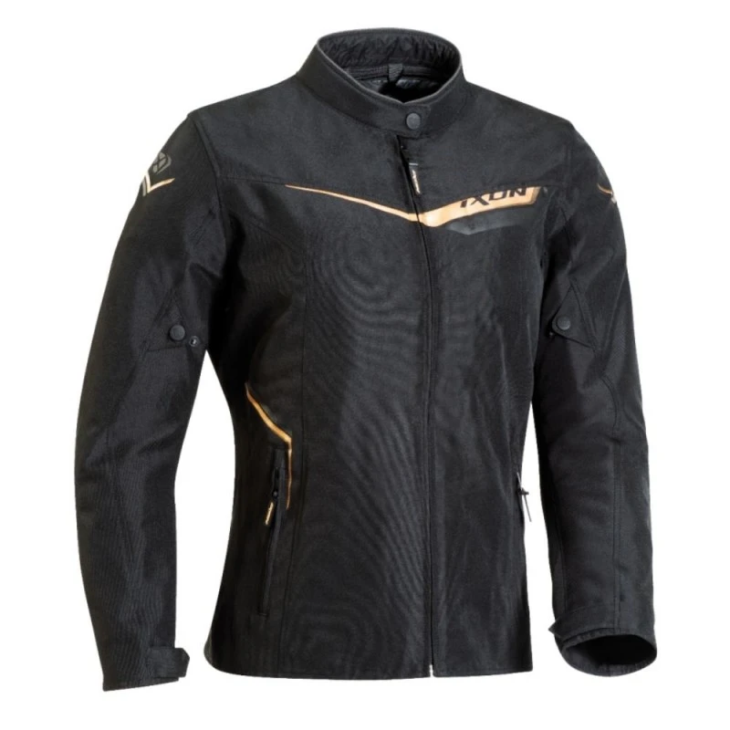 Chaqueta IXON Slash C Lady negro / dorado. Está confeccionada en poliéster 600D, con cualidades de alta resistencia tanto a la abrasión como a los desgarros. Incorpora una membrana impermeable y transpirable, así como un forro térmico extraíble de 180 gramos. Esta nueva chaqueta de IXON es compatible con el chaleco airbag de la marca (artículo no incluido).