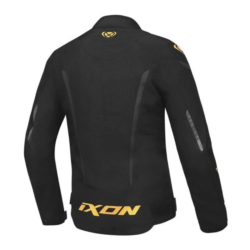 Chaqueta IXON Striker Lady negro/ dorado. Muy elegante, económica y deportiva chaqueta Ixon Striker, libre en una enorme pluralidad de colores y completísima en lo que se refiere a peculiaridades. Confeccionada en poliéster 600D, la chaqueta Ixon Striker ofrece utilidad, merced a su membrana fija Drymesh (impermeable y transpirable), al forro térmico extraíble y sus dos ventilaciones situadas en la zona frontal. Incorpora protecciones homologadas por la CE en codos y hombros (Nivel 1) y predisposición para añadir el protector dorsal de Nivel dos (no incluido). La chaqueta ixon Striker está libre tanto para mujer para hombre.