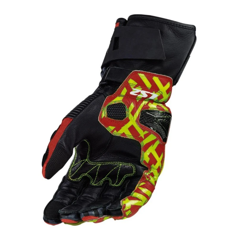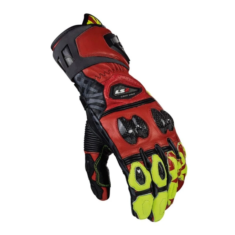 Guantes LS2 Feng Racing rojo / H-V amarillo fluor. Los guantes de LS2 son fabricados en diferentes tipos de materiales como Poliéster, poliuretano, poliamida o neopreno son varias de las fibras sintéticas utilizadas en la fabricación de la gama de Guantes LS2 resistentes, elásticos y transpirables.