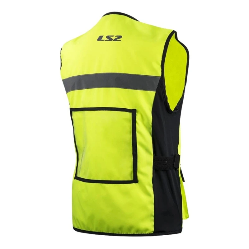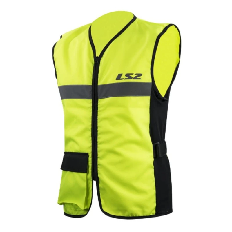 Chaleco LS2 HI-VIS amarillo. Chaleco reflectante para motocicleta/scooter, mejora la visibilidad de día, de noche y bajo la lluvia, para usar sobre la chaqueta existente, paneles elásticos en los costados, cierre de cremallera, 2 bolsillos externos