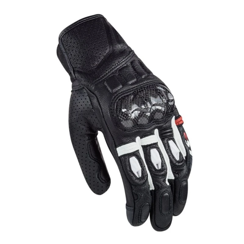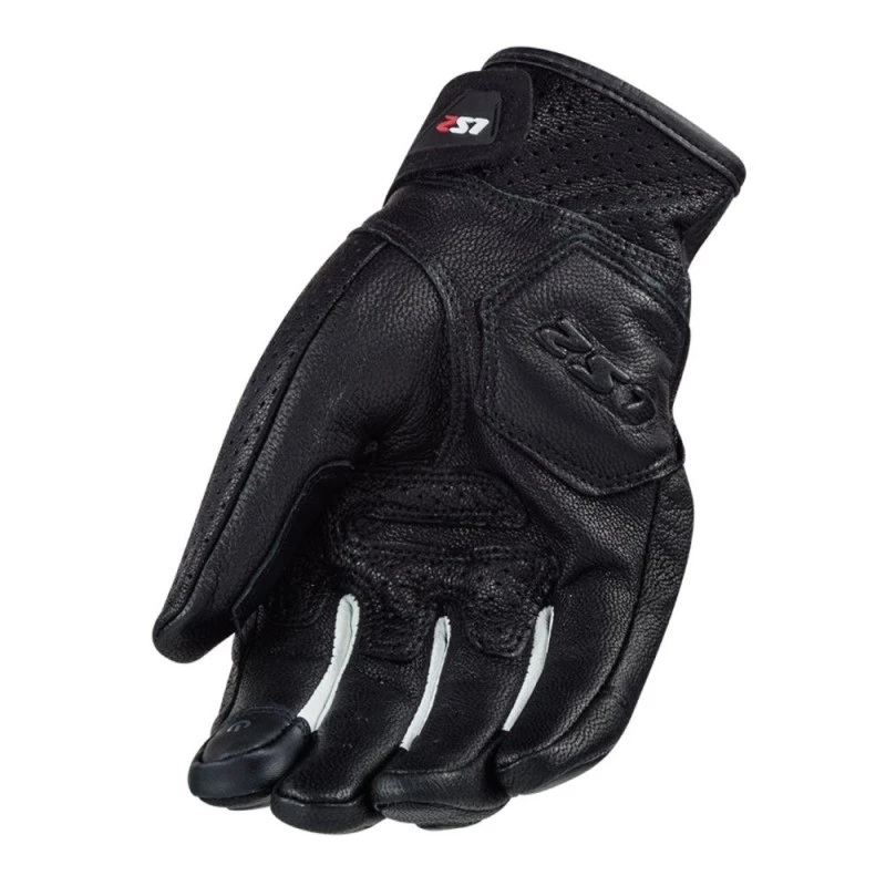 Guantes LS2 Spark blanco / negro. El LS2 SPARK es un guante deportivo corto de piel, con protecciones de carbono en los nudillos, acolchado en la palma y laterales, fuelles elásticos en los dedos y protectores de TPU. No solo está perforada la piel de vacuno, sino que incluye puntos de ventilación adicionales en la muñeca y los dedos.