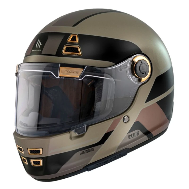 Casco MT FF119 Jarama 68TH C9 dorado mate. MT Helmets presenta su casco de moto integral MT FF119 Jarama 68TH, fabricado en policarbonato, de aspecto vintage, con nuevos mecanismos de pantalla para una extracción fácil y cierre perfecto.