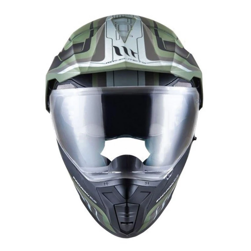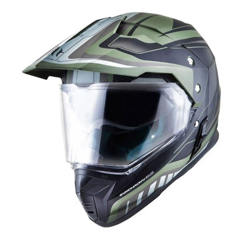 Casco MT Synchrony Duo Sport Tourer verde militar / negro mate. Confort, de diseño atrayente y de producción robusta, este casco off-road de diseño especial integra la visera y las ventilaciones en la estructura de la calota.