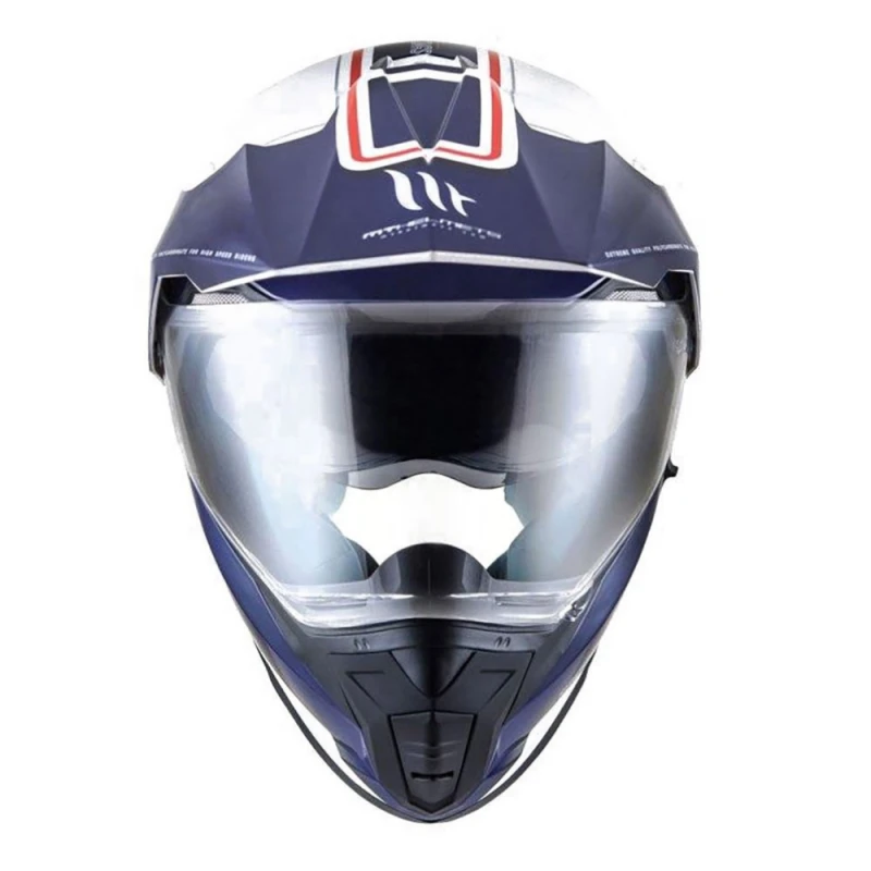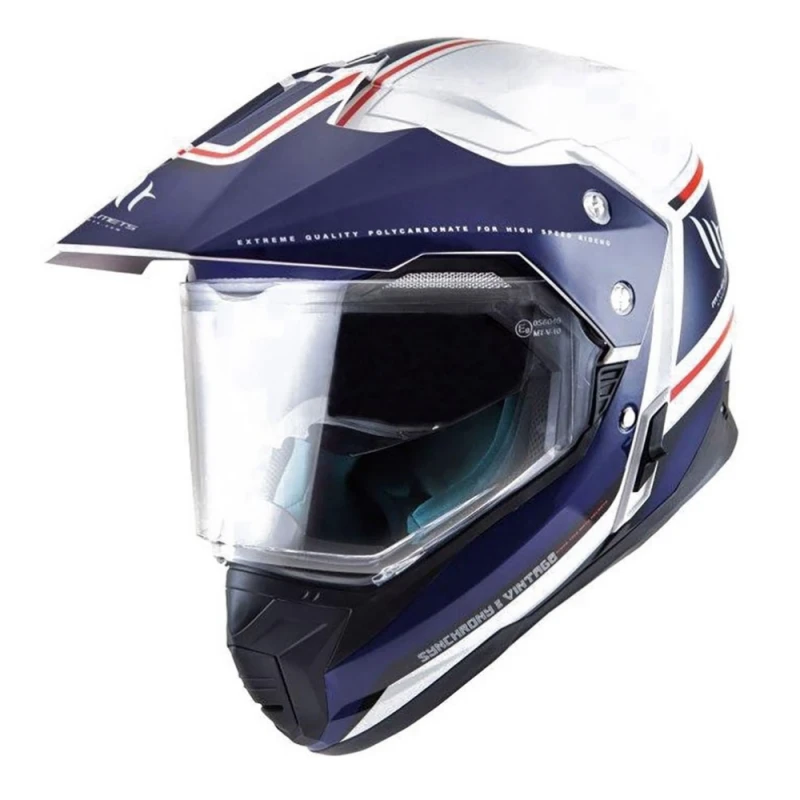Casco MT Synchrony Duo Sport Vintage blanco perla / azul / rojo brillo. Es un casco multiuso tanto para Enduro como para Quad y Touring que tiene un acabado perfecto para los amantes vintage. Gracias a su versatilidad, este casco se vuelve el ítem perfecto para los amantes de las salidas off-road y trail. Además con su amplia pantalla optimizamos la visibilidad al máximo.