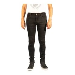 Pantalón RACERED Nevada negro. Los jeans Racered Nevada para hombre han sido confeccionados mediante la combinación de las mejores fibras naturales premium termo regulables y fibras sintéticas de última generación AAA en una sola capa de tejido ultra resistente y homologado con cualidades que garantizan la más elevada protección del conjunto del pantalón: tejido, bolsillos y protecciones; así como el cumplimiento con creces de los exigentes test ante el desgarro, abrasión e impacto. Además, ofrecen el máximo confort y comodidad para disfrutar cuando montes en moto en cualquier época del año.
