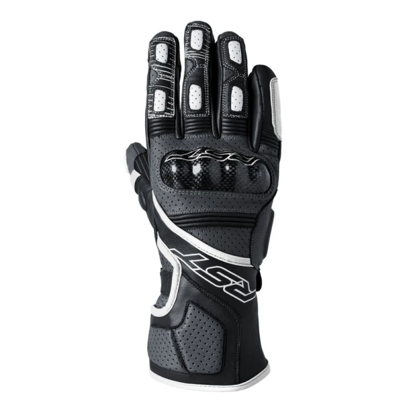 Guantes RST Flucrum blanco / negro. El Fulcrum es el flamante guante deportivo de RST y cuenta con un diseño que homenaje a la conducción urbana. Cuenta con protectores de nudillos de fibra de carbono, dedos precurvados con costura exterior, cuero de tacto digital en el pulgar y el índice, cuero de doble capa en la palma y una superficie óptima para favorecer el agarre en los manillares. También disponible en versión impermeable.