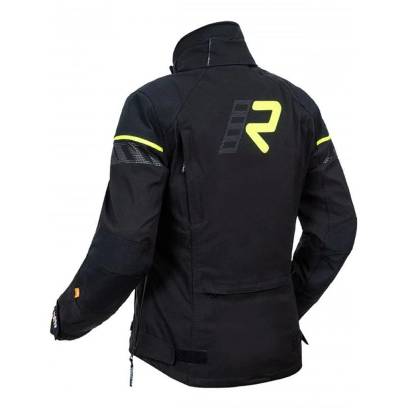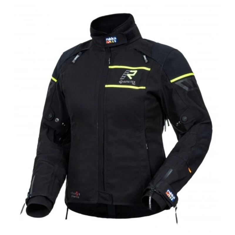 Chaqueta RUKKA Raptorina Lady negro / fluor. La nueva chaqueta de Rukka diseñada especialmente para mujeres con Gore-Tex Pro laminado de tres capas, con ventilaciones en hombros, costados, espaldas y mangas, también cuenta con diferentes bolsillos impermeables, cuenta también con un forro interior de plumón (90% Plumón y 10% Pluma)que también se vende por separado Down-Y, la chaqueta también incorpora una correa en la entrepierna y una cremallera de conexión larga para los pantalones RaptoRina.