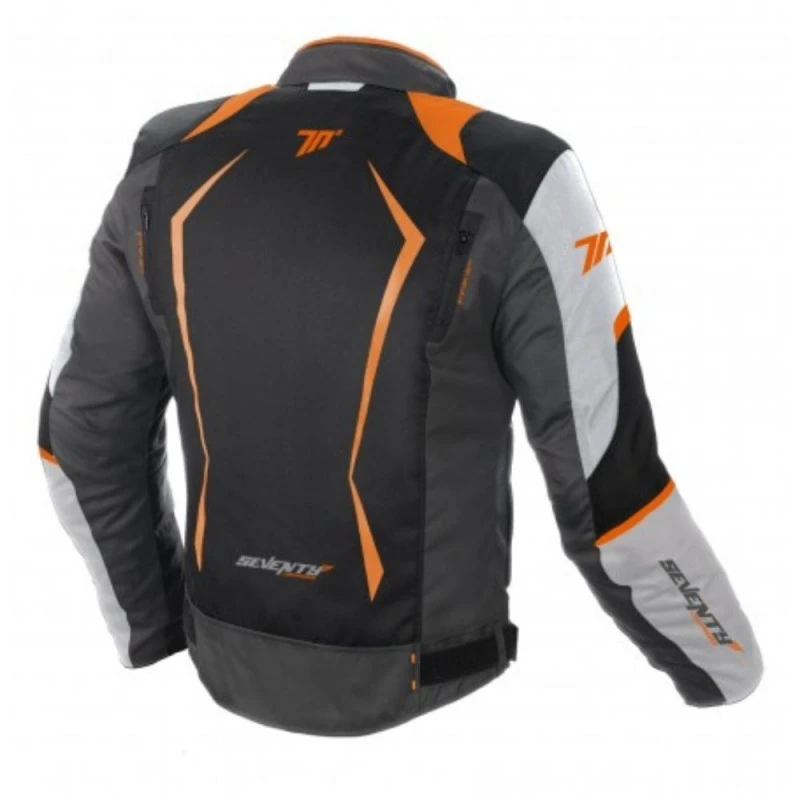 Chaqueta SEVENTY SD-JR47 Invierno Racing Hombre gris oscuro / naranja. Corta y deportiva, que resalta por su diseño violento. Efectuada con tejido exterior en poliéster 600D de alta resistencia, dispone de inserciones de neopreno en el cuello para mayor comodidad. Cuenta con forro térmico desmontable, y lleva membrana que la hace cien por ciento impermeable. Dispone de ventilaciones en la parte delantera y trasera para facilitar la transpiración. Protecciones homologadas en hombros, codos, antebrazos y espaldera. Cintas de ajuste en brazos y cintura para eludir el flaneo.