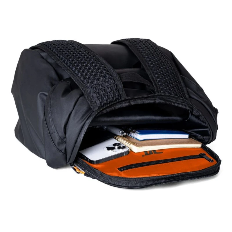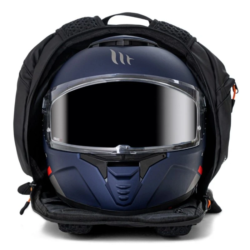 Mochila SEVENTY SD-TB3 negro. Práctica mochila antirrobo de aproximadamente 28 litros de capacidad, de diseño minimalista y elegante, pensada para llevar el casco y mucho más. Compartimiento principal con cremallera de acceso trasera, con capacidad para casco integral, apertura por la espalda con acceso extra amplio. También cuenta con una solapa divisoria para documentos, portatil o tablet y un bolsillo con cremallera. Bolsillo delantero amplio para otros objetos. Confeccionada en poliester laminado con PU y cremalleras, repelente al agua. Correas de hombro de ajuste rápido. Cinta del pecho ajustable también en altura. Funda impermeable naranja y detalles reflectantes. Espalda y correas de hombros acolchadas y ventiladas para ofrecer el mayor confort en desplazamientos.