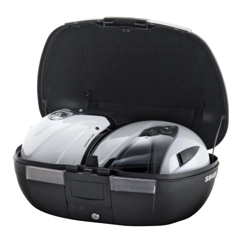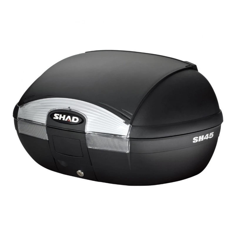 Baúl SHAD SH45 negro. Top Case de gran capacidad para guardar hasta 2 cascos integrales, disponible en una amplia gama de colores. Contiene el “Handle Lock System”, que le proporciona seguridad gracias a un doble cierre, que fija la maleta a la moto y cierra el propio baúl.