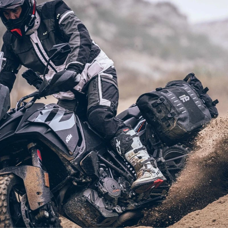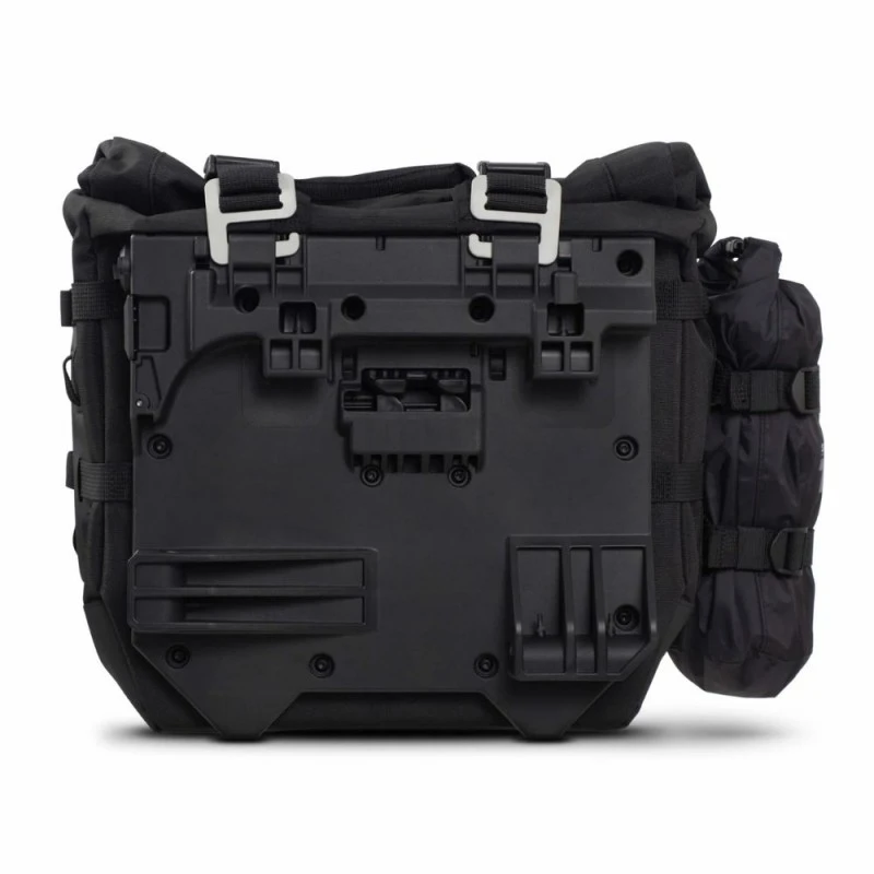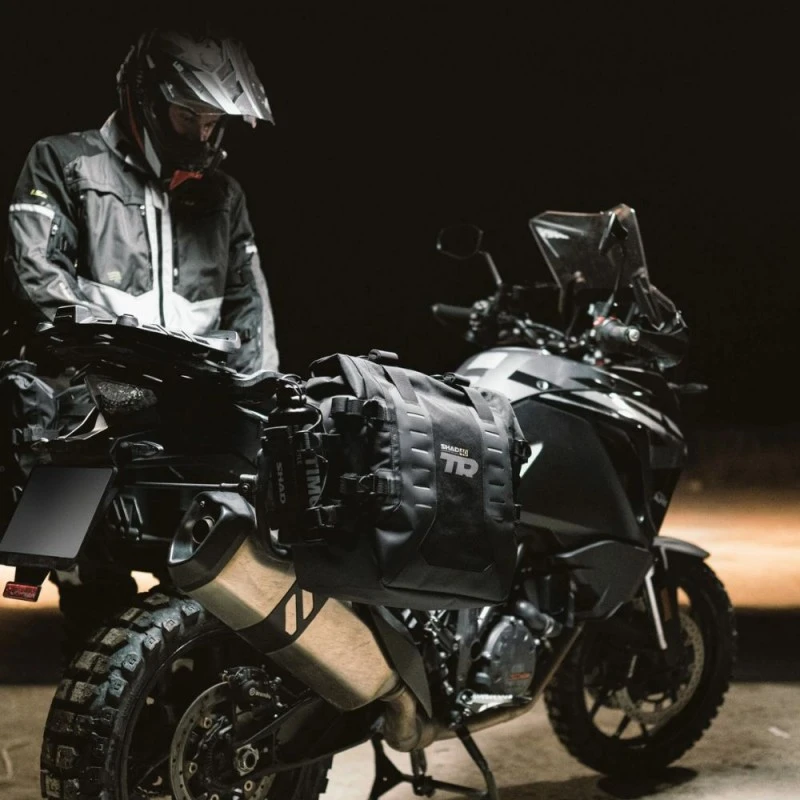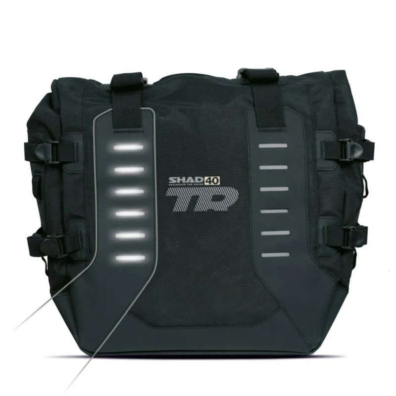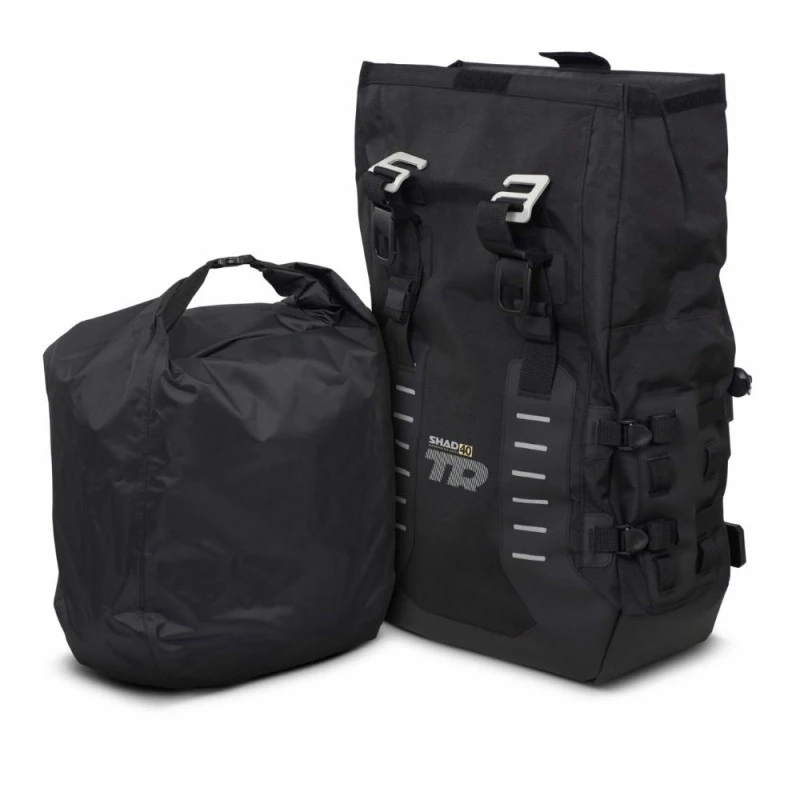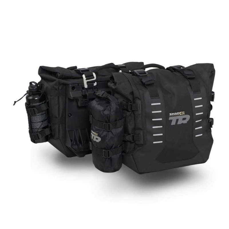 Alforjas SHAD Terra TR40. Conjunto de alforjas de aventura TR40 diseñado en Barcelona y con capacidad de hasta 64 litros. Fabricadas en material ultra resistente a la abrasión que garantiza la impermeabilidad gracias a la combinación del plegado enrollable más la bolsa interna. Sistema de cierre “Double Locking System” (patent pending) para bloquear la bolsa sobre la fijación 4P y 3P e impedir el acceso a su interior.