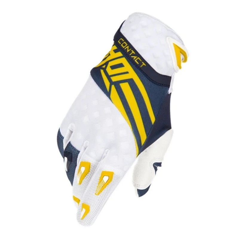 Guantes SHOT Contact Raceway amarillo / azul. Los Contact Fast de Shot son unos guantes de cross para moteros que buscan la máxima velocidad. Con unos puños Liteprene, malla con ventilación tridimensional para conseguir el máximo flujo de aire y cuatro ganchos de lycra, disfrutarás de unos guantes de cross cómodos, transpirables y que proveen la flexibilidad que necesitas para triunfar. La palma se ha reforzado con una gamuza para aumentar su resistencia y brindar mayor protección. El cierre de muñeca regulable con una banda autoadhesiva garantiza un ajuste personalizado, mientras que las impresiones de silicona en los dedos brindan un agarre óptimo sobre los controles para ayudarte a acelerar en tu camino hacia la victoria.