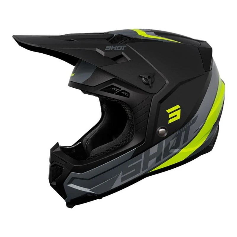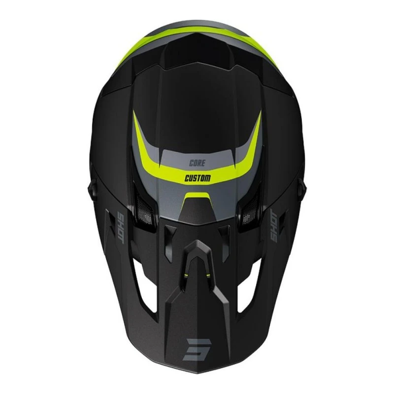 Casco SHOT Core Custom amarillo neón mate. Casco todoterreno que ofrece un amplio campo de visión, una ventilación optimizada y un peso ligero, para que practiques tu pasión por las motos con total seguridad.