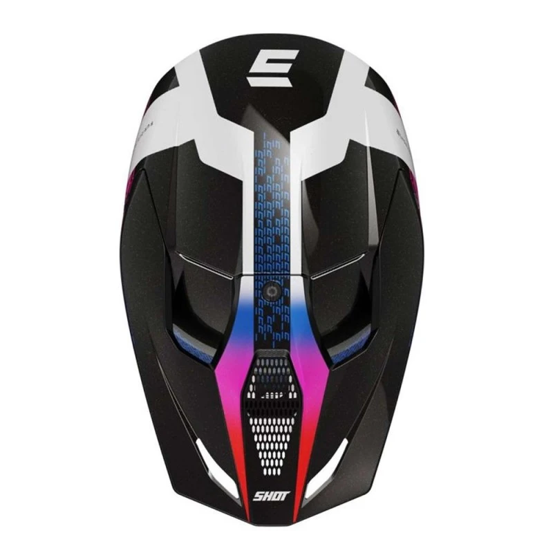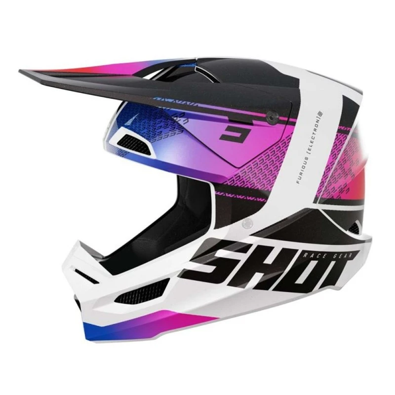 Casco SHOT Furious Electron púrpura brillante. Ligero y cómodo de llevar, el Furious de Shot es un casco de motocross SRS de policarbonato para adultos que ofrece un amplio campo de visión y una excelente ventilación. El Furious está diseñado para cumplir los exigentes requisitos de los pilotos, así como la norma ECE 22.06.