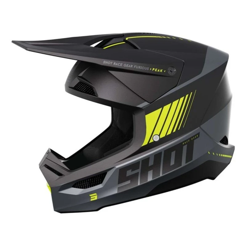 Casco SHOT Furious Peak gris / amarillo neón mate. Ligero y cómodo de llevar, el Furious de Shot es un casco de motocross SRS de policarbonato para adultos que ofrece un amplio campo de visión y una excelente ventilación. El Furious está diseñado para cumplir los exigentes requisitos de los pilotos, así como la norma ECE 22.06.