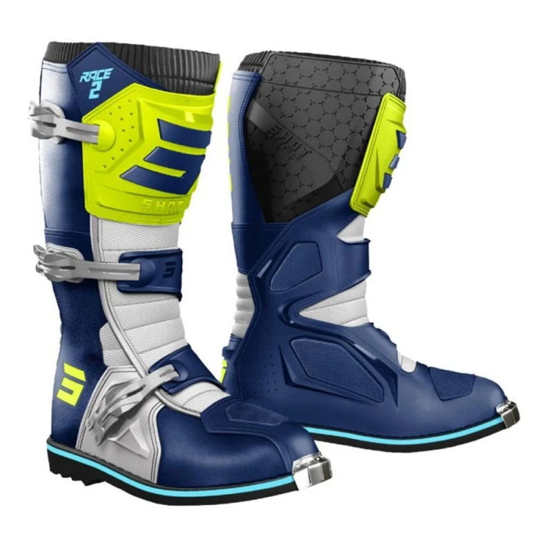 Botas SHOT Race 2 azul / amarillo neón. Botas de motocross Shot fabricadas en piel sintética de alta calidad, ligeras y duraderas. Inserciones acolchadas en el tobillo y suela exterior cosida doble, para una buena absorción de impactos.