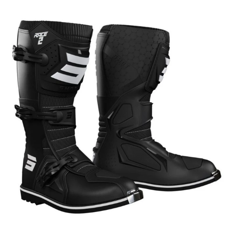 Botas SHOT Race 2 negro. Botas de motocross Shot fabricadas en piel sintética de alta calidad, ligeras y duraderas. Inserciones acolchadas en el tobillo y suela exterior cosida doble, para una buena absorción de impactos.