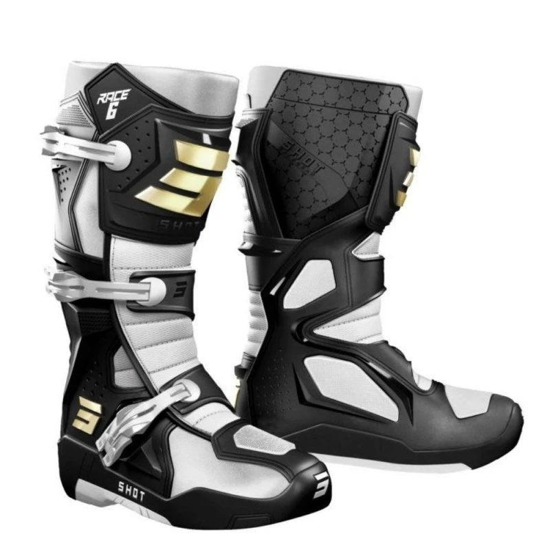 Botas SHOT Race 6 negro / blanco / oro. Botas para moto enduro o motocross Shot, Modelo Race 6, Temporada Continuativo, Chasis anatómico precurvado en cuero sintético, Protección exterior inyectada y frontal de plástico, 3 hebillas de doble cierre, Forro cómodo y transpirable, Inserciones protectoras acolchadas en el tobillo, Suela de cemento.