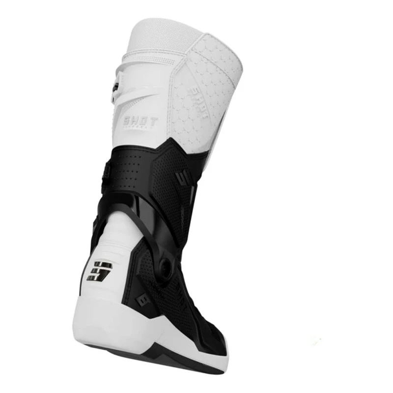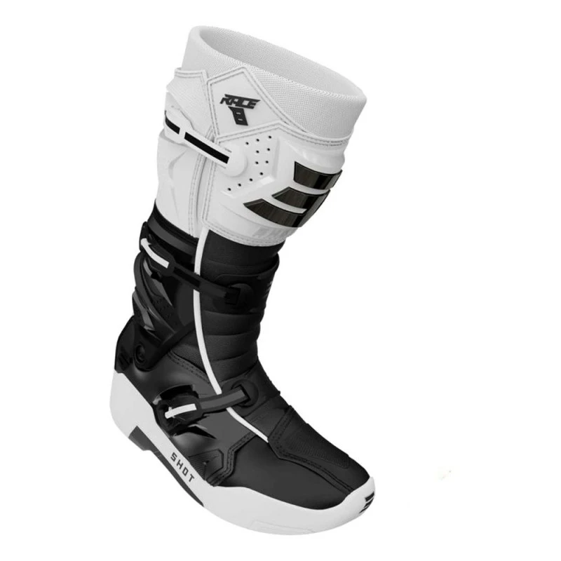 Botas SHOT Race 8 blanco / negro / cromo. Las Race 8 de Shot son unas botas de motocross para adultos con protección maleolar D3O Aeromax. Son ligeras, flexibles y lo suficientemente versátiles para adaptarse a todas las condiciones.