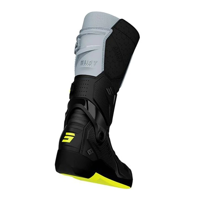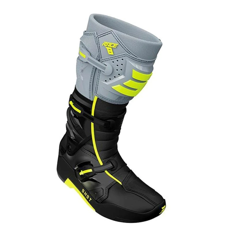 Botas SHOT Race 8 negro / amarillo neón. Las Race 8 de Shot son unas botas de motocross para adultos con protección maleolar D3O Aeromax. Son ligeras, flexibles y lo suficientemente versátiles para adaptarse a todas las condiciones.