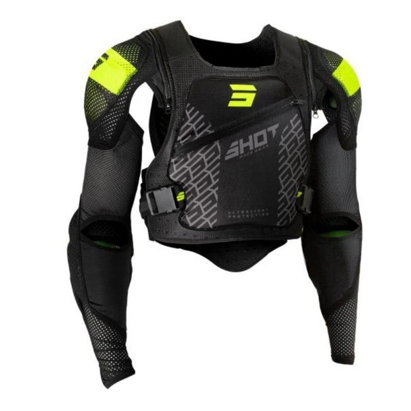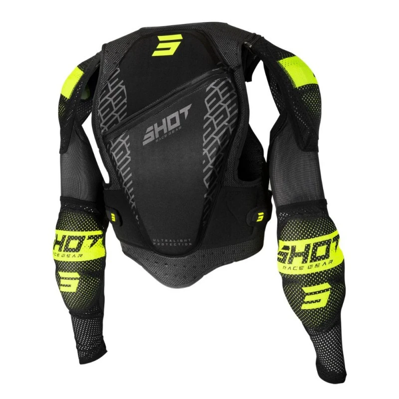 Peto SHOT Ultraligth 2.0 negro / amarillo. Peto integral conformado por protecciones de termoplastico inyectado en espalda, pecho, codos y hombros