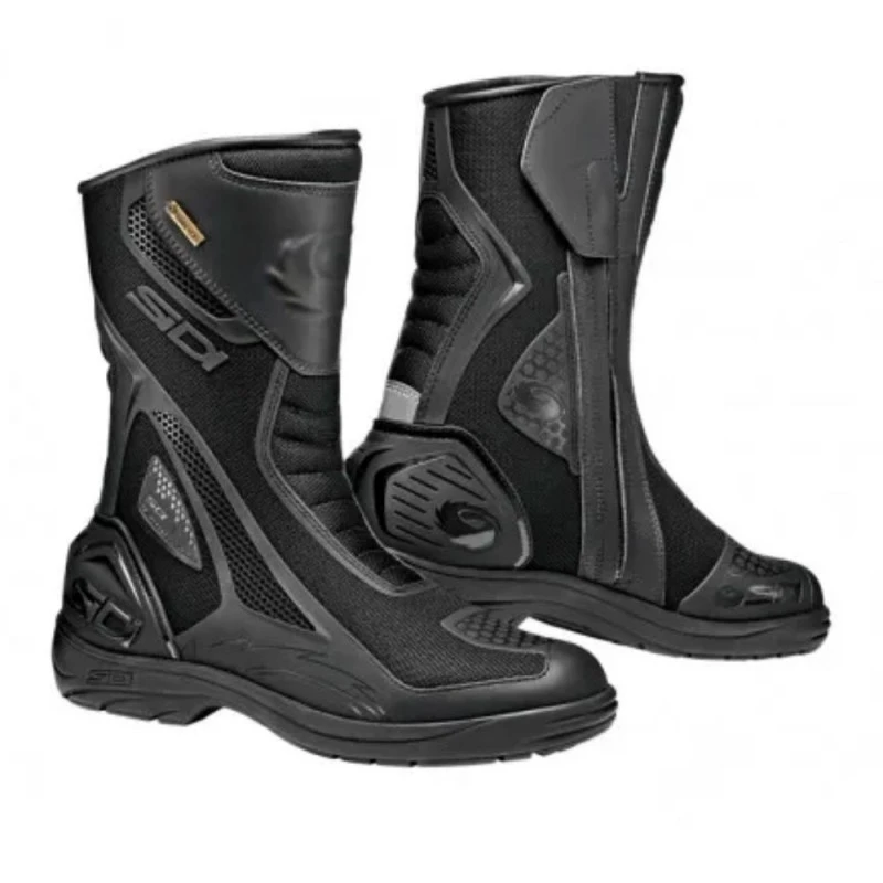 Botas SIDI Aria Gore negro / negro. Una bota desarrollada para estaciones estivales o zonas geográficas calurosas. Merced a sus extensas zonas confeccionadas en malla los pies del motorista se sostendrán frescos a lo largo del viaje ¿Y en el caso de lluvia? Las tormentas veraniegas no van a ser un inconveniente, las ARIA GORE disponen de membrana Gore-Tex 100% impermeable y transpirable.
