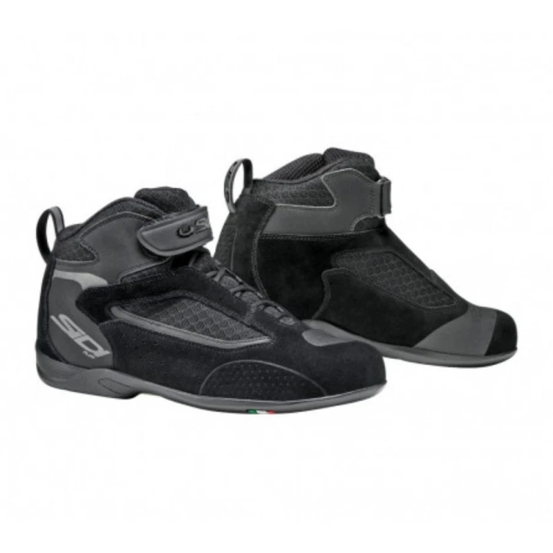 Botas SIDI Gas Flow negro. Se trata de una botas elabodas expresamente para circular de forma cómoda ciudad. El diseño moderno de la Gas integra prudentemente una serie de protecciones para no abandonar a la seguridad. Con un diseño de construcción ligera merced a los materiales utilizados, ofrece buenos niveles de ventilación para asegurar un uso fresco y cómodo. Exterior confeccionado en piel con malla de Nailon, que le proporciona durabilidad y resistencia a la abrasión. Sistema de cierre mediante cordones con banda graduable de Velcro que deja un abrochado rápido, seguro y con buena fijación. Suela de goma exageradamente ligera desarrollada para proporciona un agarre genial y todo género de condiciones. Partes de la bota micro inyectadas, especialmente en las zonas con mayor desgaste y mas expuesta a los golpes.