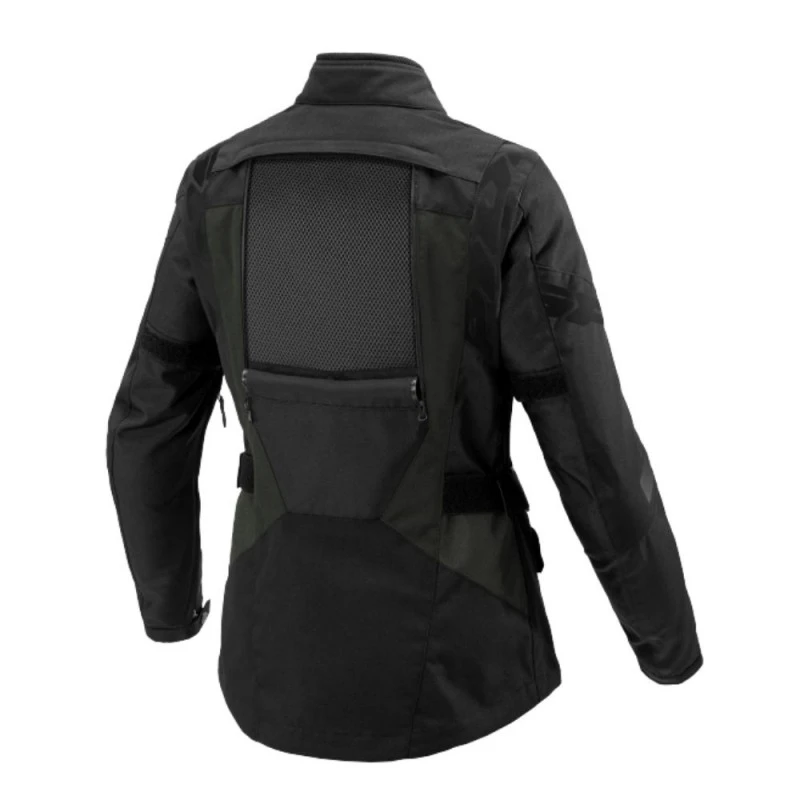 Chaqueta SPIDI 4 Season Evo Lady verde oscuro / negro. La chaqueta 4 Season Evo Lady tiene certificación CE según la norma Pr En 17092-4:2020 Clase A, y viene con protectores extraíbles ForceTech en los hombros y codos Warrior Lite, que cuentan con la certificación CE Nivel 2 según la norma EN 1621-1: norma 2012. El equipamiento estándar de Step-In Wear incluye 2 chaquetas interiores separadas: una impermeable, confeccionada con tejido transpirable e impermeable 5k/5k H2Out®, y un forro térmico de 100gr/m². Es posible utilizar cada una de las 3 partes de 4 Season Evo Lady de forma independiente o combinada con 1 o 2 componentes más.